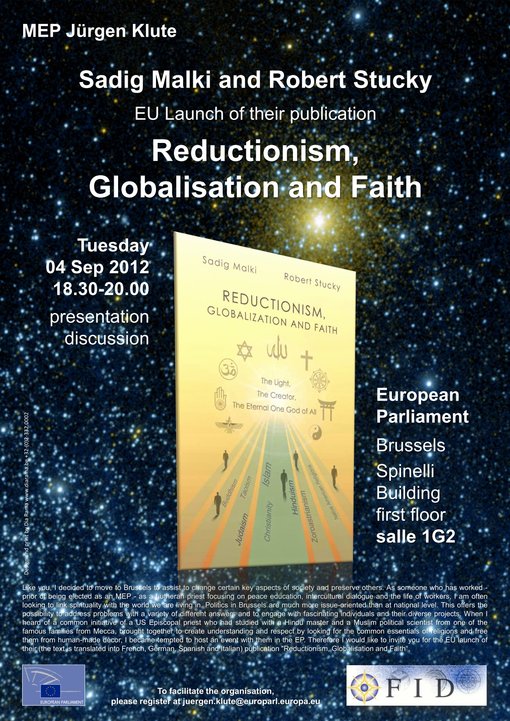 Die Theologen Sadig Malki (Saudi-Arabien) und Robert Stucky (USA) suchen nach Wegen, die Grenzen der Religionen zu überwinden, ohne kulturelle Vielfalt zu opfern. Ihr gemeinsames Buchprojekt 'Reduktionismus, Globalisierung & Glauben' soll dazu einen Beitrag leisten. Es erscheint auf Englisch, Deutsch, Französisch, Italienisch und Spanisch und wurde am 4. September 2012 auf Einladung von Jürgen Klute erstmals einer europäischen Öffentlichkeit vorgestellt. Hier dokumentieren wir einige Berichte zur Diskussion und Buchvorstellung:
