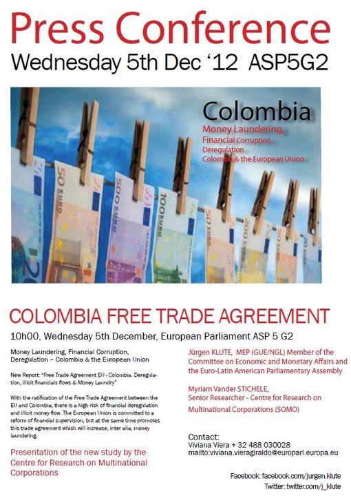 With the ratification of the Free Trade Agreement between the EU and Colombia there will be a financial liberalisation and deregulation which will bring about a high risk of increasing illicit money flows, money laundering and tax evasion. While the European Union is committed to a reform of financial supervision in the context of the current crisis, it is doing the opposite by promoting this trade agreement, which will make it very difficult to introduce an adequate regulation of the financial sector in both regions.