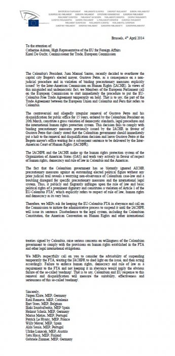 We MEPs respectfully call on you to consider the advisability of suspending temporarily the FTA, waiting the IACHPR to shed light on the issue, and then acting accordingly. Failure to enforce human rights, democracy and rule of law as a requirement to the FTA and not keeping it in abeyance would imply the obvious failure of the so-called 'roadmap'. That is to say, Colombian and EU response to this removal and disqualification will measure the suitability, effectiveness and seriousness of this so-called 'roadmap'.